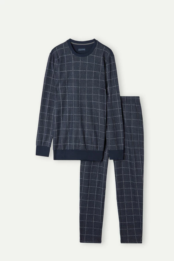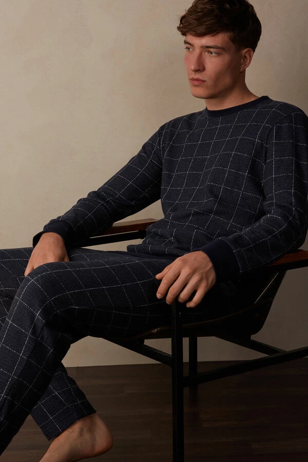 Full length check patterned pajamas in soft tricot effect fabric. Long sleeve crewneck top with cuffs and solid color back in interlock cotton. Straight cut full length pants with side pockets. Regular fit.