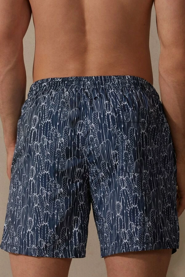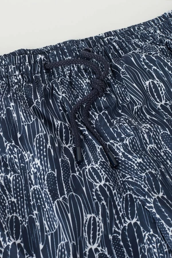 Cactus print swim trunks in soft and light quick-dry waterproof fabric. It features a comfortable internal briefs style lining in soft jersey in the same color as the trunks. Features practical side pockets and a back pocket. The waistband gathers with a drawstring with a practical grommet on the side to use for keys. Regular fit with mid-thigh length.