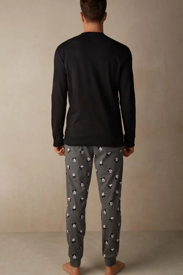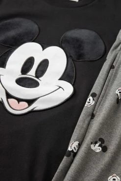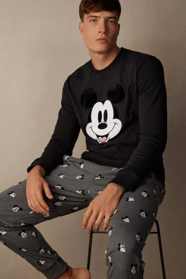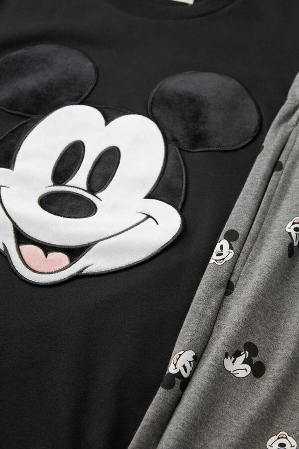 Full length pajamas in cotton interlock with solid color crewneck shirt with velvet Mickey Mouse patch. Pants with all over Mickey Mouse print, side pockets, and cuffs. Regular fit.
