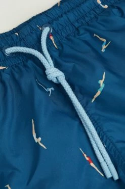 Diver print swim trunks in soft and light quick-dry waterproof fabric. It features a comfortable internal briefs style lining in soft jersey in the same color as the trunks. Features practical side pockets and a back pocket. The waistband gathers with a drawstring with a practical grommet on the side to use for keys. Regular fit with mid-thigh length.