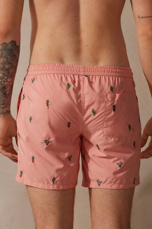 Swim trunks in soft and light quick-dry waterproof fabric with embroidered cacti. It features a comfortable internal briefs style lining in soft jersey in the same color as the trunks. Features practical side pockets and a back pocket. The waistband gathers with a drawstring with a practical grommet on the side to use for keys. Regular fit with mid-thigh length.