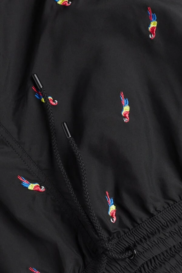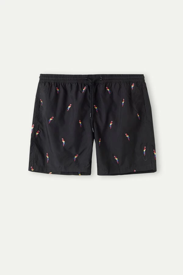 Swim trunks in soft and light quick-dry waterproof fabric with embroidered parrots. It features a comfortable internal briefs style lining in soft jersey in the same color as the trunks. Features practical side pockets and a back pocket. The waistband gathers with a drawstring with a practical grommet on the side to use for keys. Regular fit with mid-thigh length.