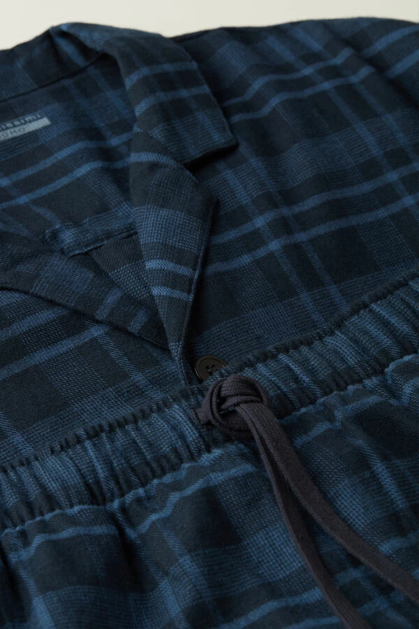 Full length pajamas in brushed cotton cloth with blue shaded check pattern. Shirt with front buttons and lapel collar, back squared yoke with pleats. Pants with drawstring waist and side pockets. Regular fit.