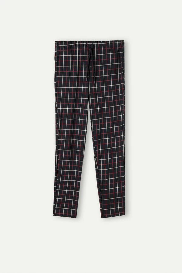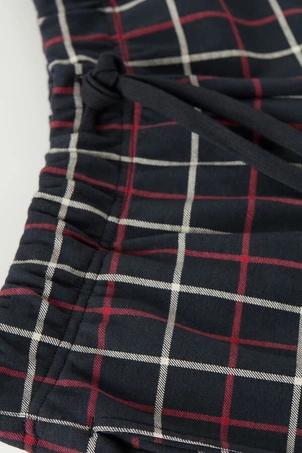 Long trousers in cotton interlock featuring a checkered print in red and cream tones on a blue base. Drawstring waist and side pockets. Regular fit.