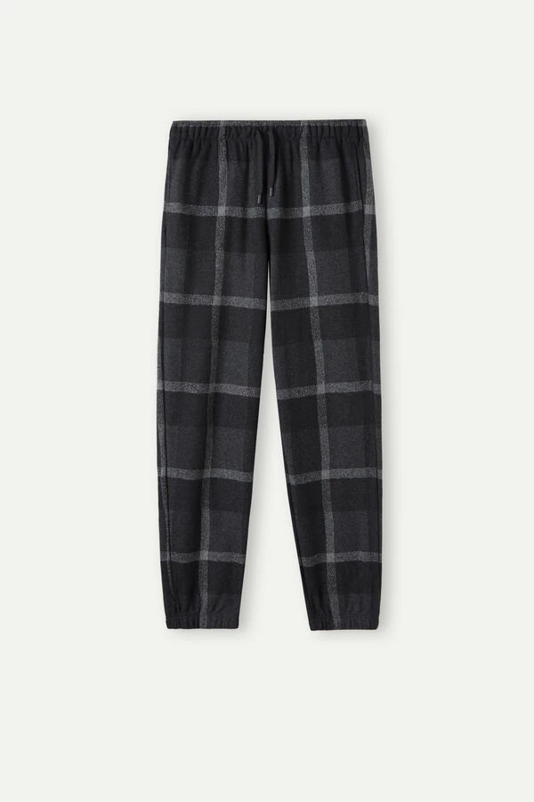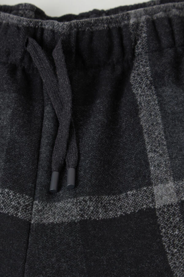 Full length tricot pants in macro check pattern with gathered drawstring waist, side pockets, and elastic cuffs. Regular fit. Ideal for those looking for something warm and cozy to wear for free time.