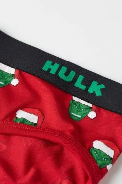 Briefs with Christmas themed Hulk print in soft stretch Supima® cotton. Exposed soft elastic, brushed on the interior, with Hulk text. Softly hug the body.