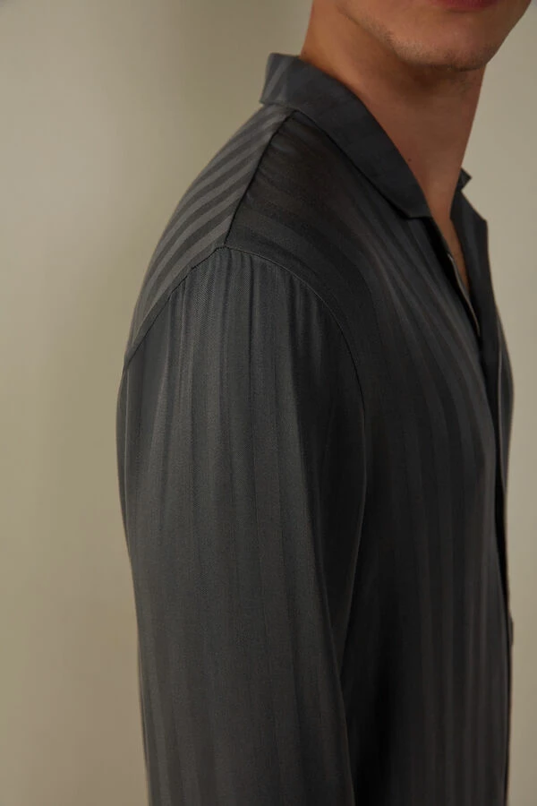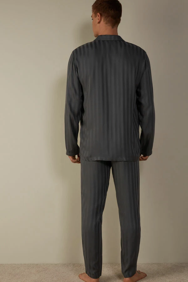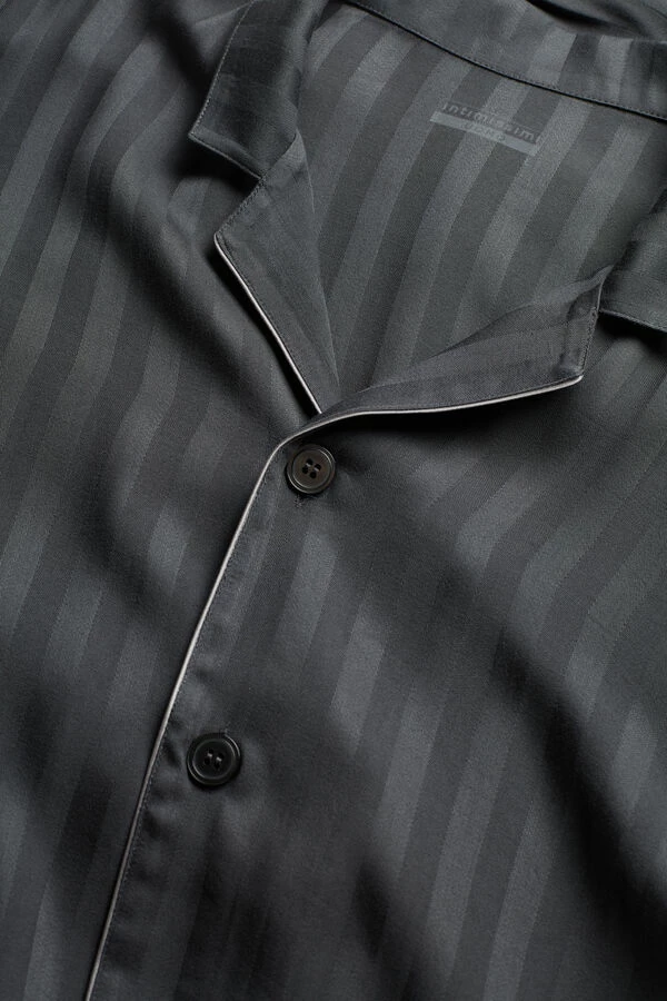 Long modal pajama pants with vertical monochrome print. Button-front jacket with revere collar and contrast front trim. Pants with stretch waist and side pockets.