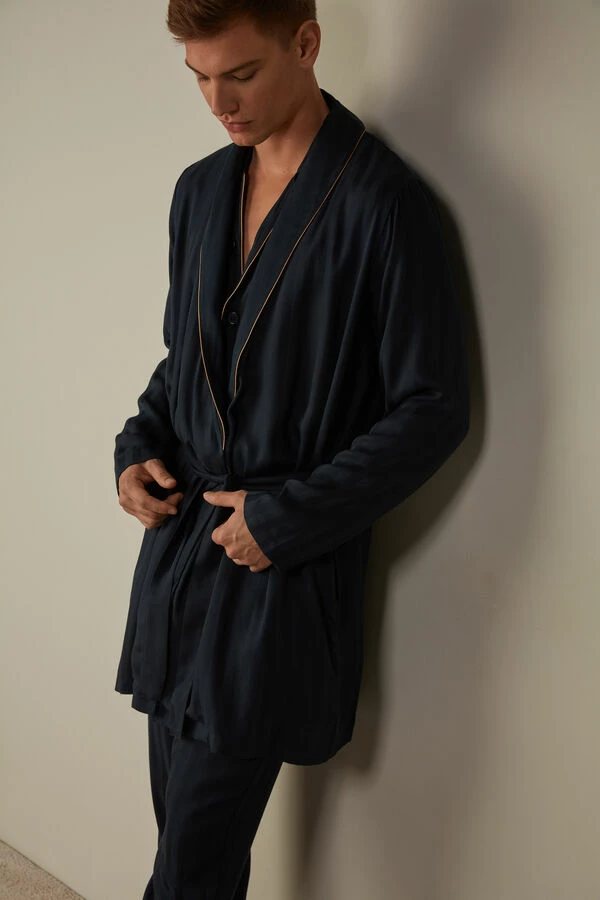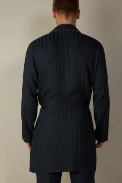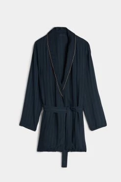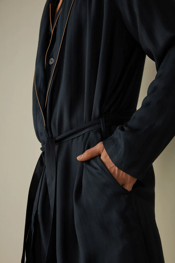 Modal robe with vertical monochrome print. The garment has a contrast front trim and belt at the waist.