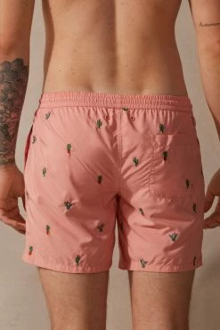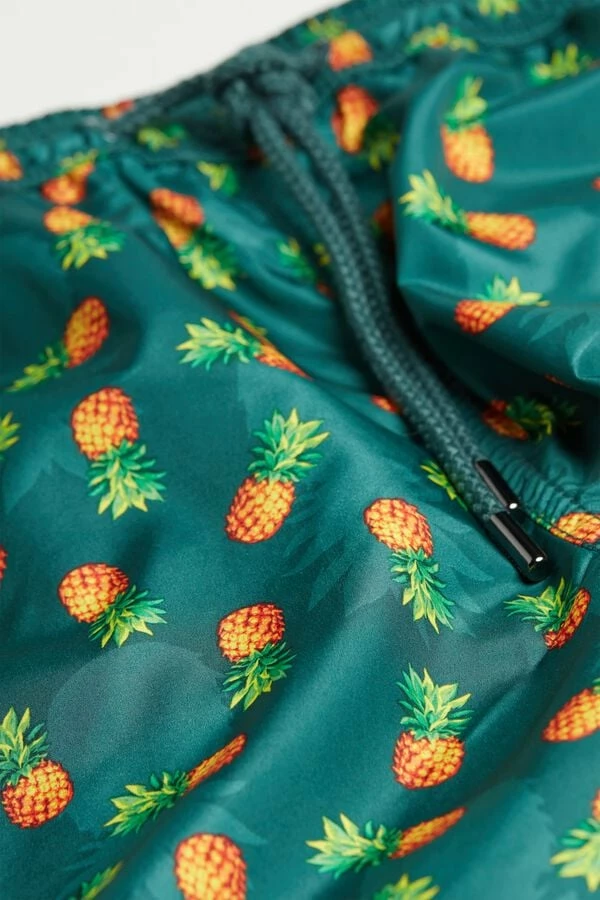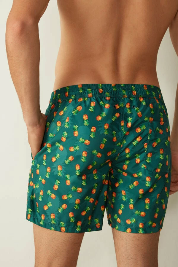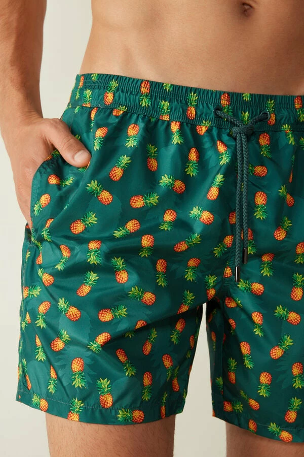 Medium length swim trunks in soft waterproof fabric featuring a pineapple print. Features an internal briefs-like lining in soft jersey characterized by side pockets and a back pocket. The waistband gathers with a drawstring. The fabric in this garment contains recycled fibers.