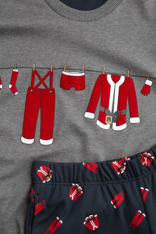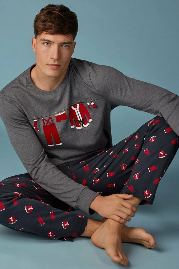 Full length pajamas in cotton interlock with solid color crewneck shirt with charming flocked print of Santa Clausβs clothes. Pants with all over clothes print and side pockets. Regular fit.