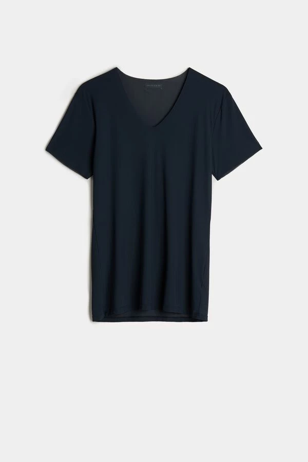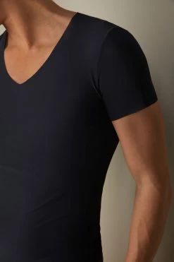 Men’s half-sleeve micromesh T-shirt with a V-neck. The deep neckline and seamless details make it the perfect base layer style. Super breathable and antibacterial fabric for an all-day dry feeling. The model is 6’1 tall and is wearing size L. Sold in Intimissimi Man stores.