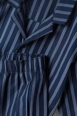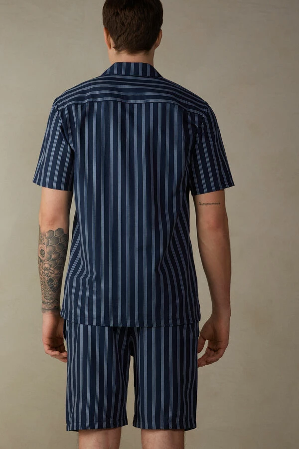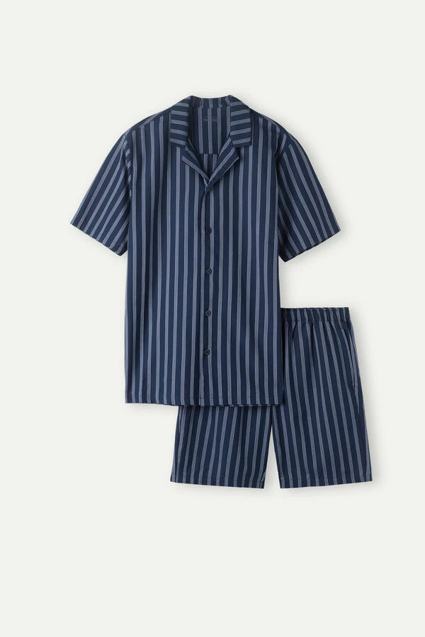 Short pajamas in striped pattern plain weave cotton in shades of blue. Shirt with front buttons and lapel collar and shorts with side pockets.