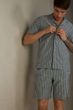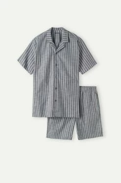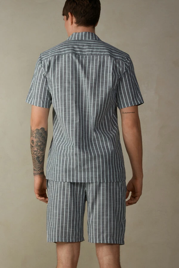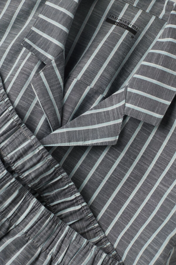 Short pajamas in striped pattern plain weave cotton in shades of grey. Shirt with front buttons and lapel collar and shorts with side pockets.