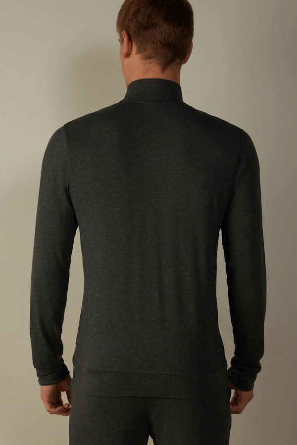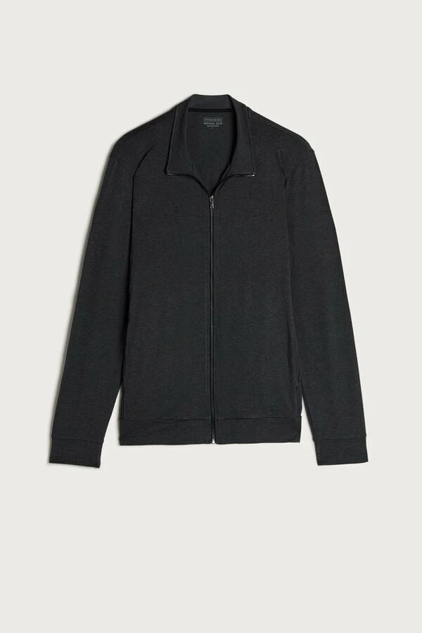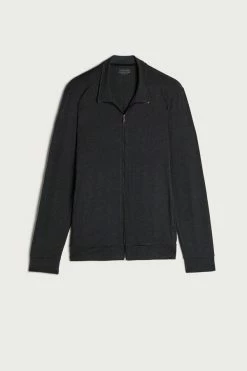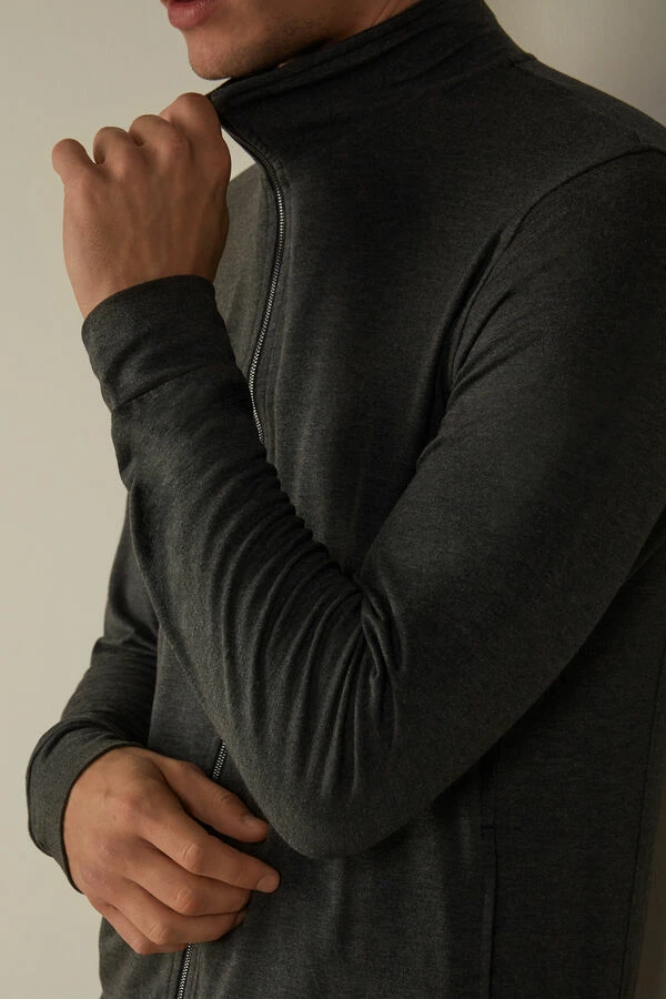 Men’s long-sleeved sweatshirt made from silk and modal with a front zip and pockets.