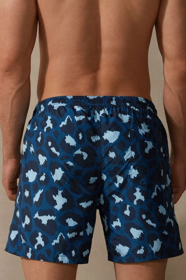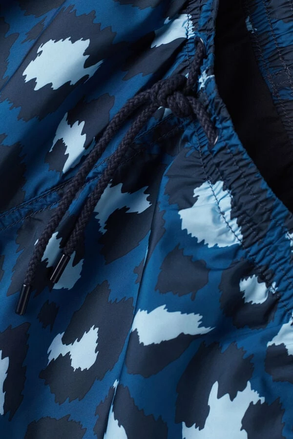 Swim trunks with a spot pattern made in soft and light quick-dry waterproof fabric with light ruched effect. It features a comfortable internal briefs style lining in soft jersey in the same color as the trunks. Features practical side pockets and a back pocket. The waistband gathers with a drawstring with a practical grommet on the side to use for keys. Regular fit with mid-thigh length.
