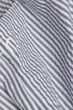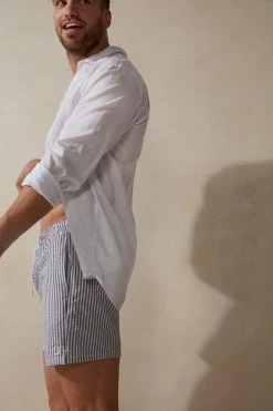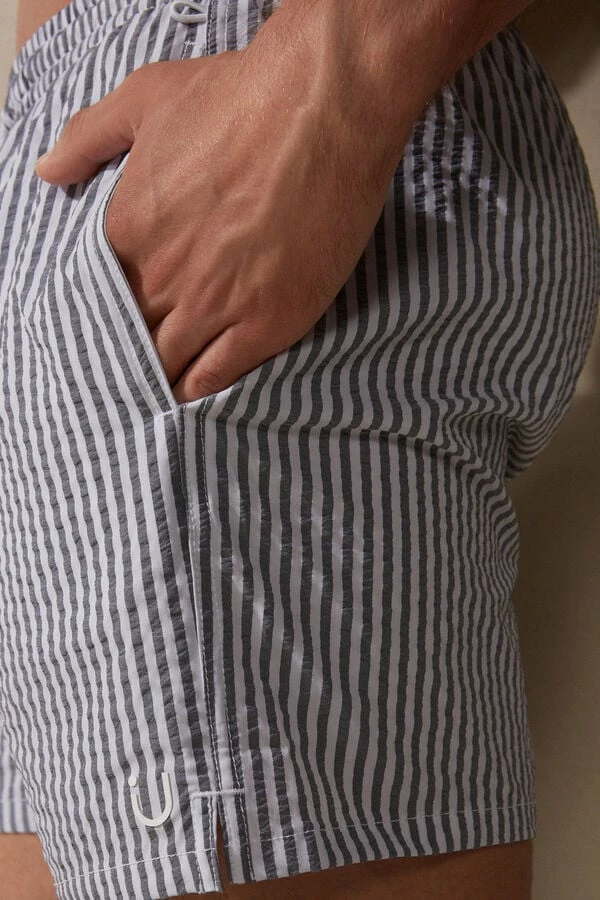 Stripe print swim trunks in soft and light quick-dry waterproof fabric with light ruched effect. It features a comfortable internal briefs style lining in soft jersey in the same color as the trunks. Features practical side pockets and a back pocket. The waistband gathers with a drawstring with a practical grommet on the side to use for keys. Regular fit with mid-thigh length.