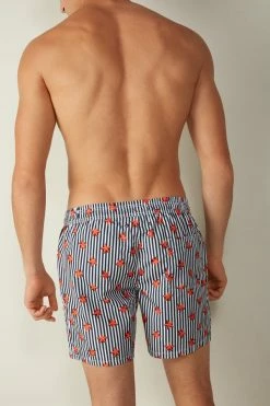 Medium length swim trunks in soft waterproof fabric featuring a stripes and star fish print. Features an internal briefs-like lining in soft jersey characterized by side pockets and a back pocket. The waistband gathers with a drawstring.