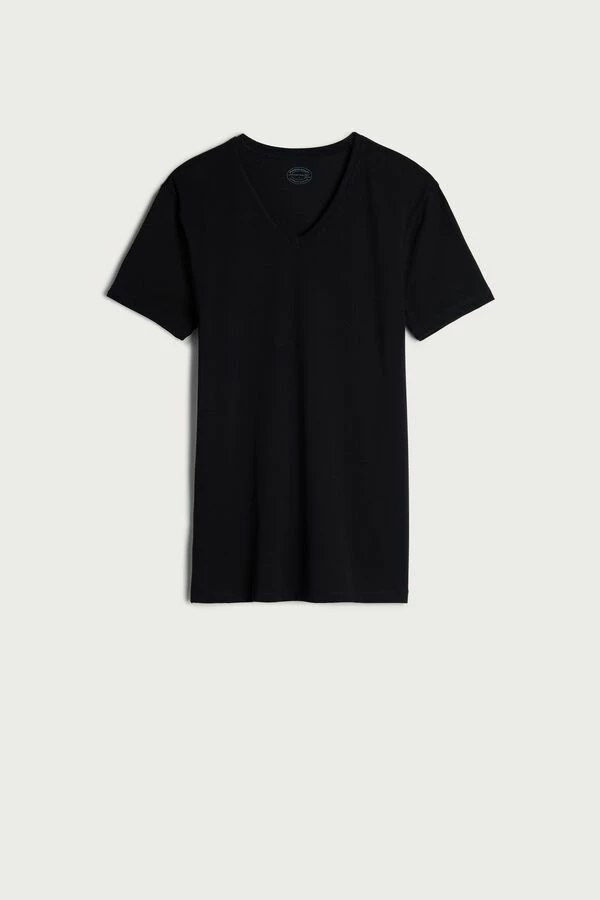 Short sleeve V-neck T-shirt in stretch Supima® cotton. The fiber of the highest quality, incredibly soft and breathable, it features optimal elasticity. The structure of the fabric guarantees excellent durability from washing. A simple and comfortable piece.