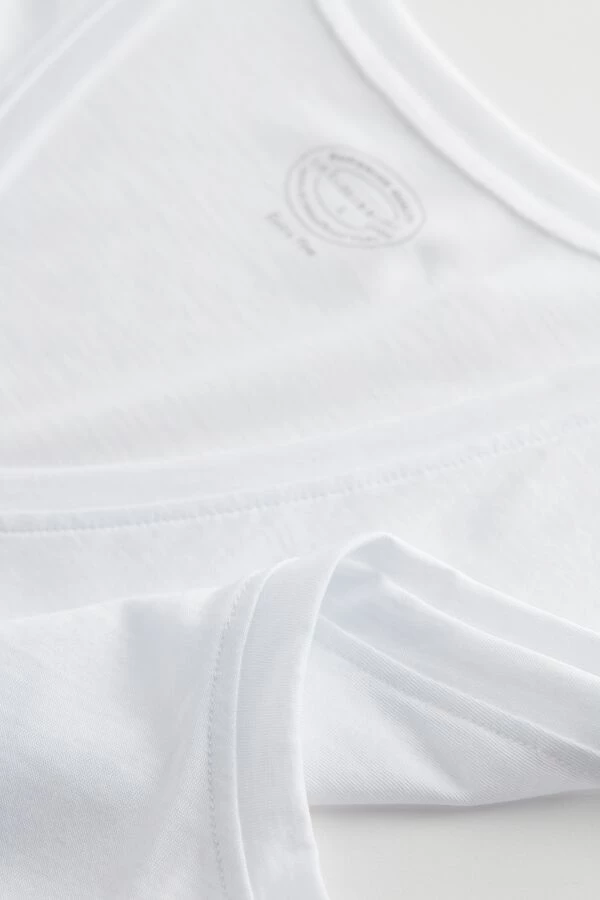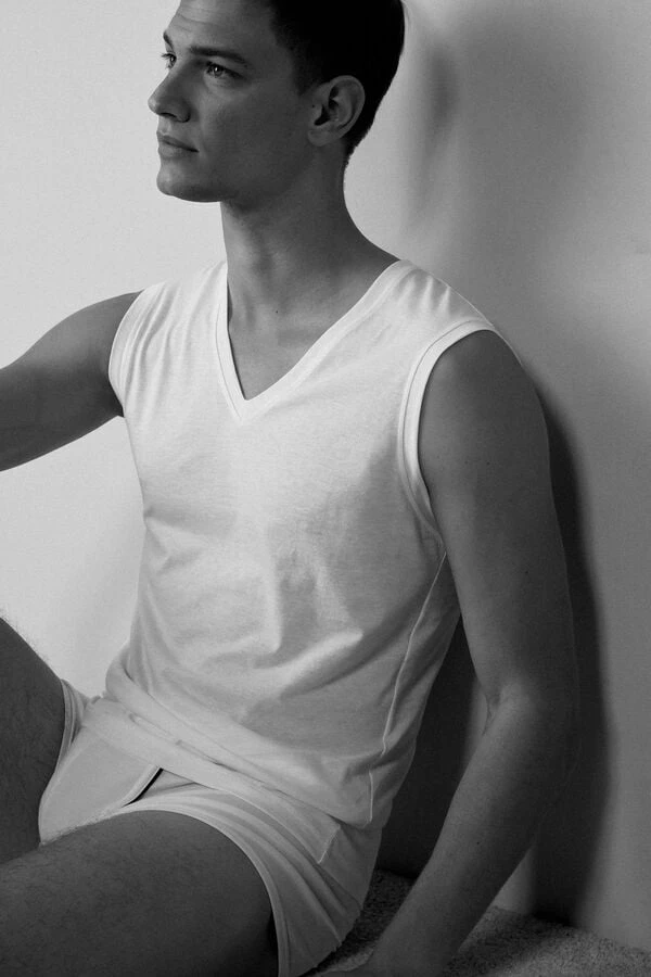 Sleeveless vest top with wide straps and a V-neck in 100% Extra-Fine SUPIMAยฎ Cotton. Incredibly soft and breathable, this premium fiber offers excellent elasticity. The structure of the fabric means it will last wash after wash. A simple, comfortable style that’s ideal for any occasion, whether worn as underwear or outerwear.